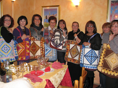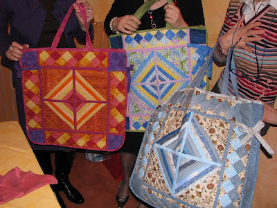 and here all.......the bags created with a block that Cosetta taught during the Quilting Day in October. Each quilter did her own bag and all together did Ileana's bag.